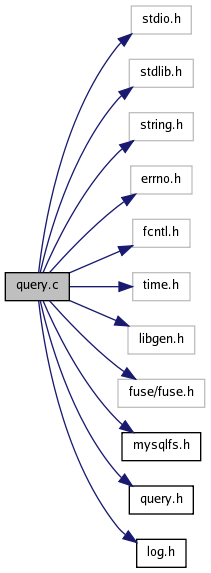 #include <stdio.h>#include <stdlib.h>#include <string.h>#include <errno.h>#include <fcntl.h>#include <time.h>#include <libgen.h>#include <fuse/fuse.h>#include "mysqlfs.h"#include "query.h"#include "log.h"Include dependency graph for query.c: